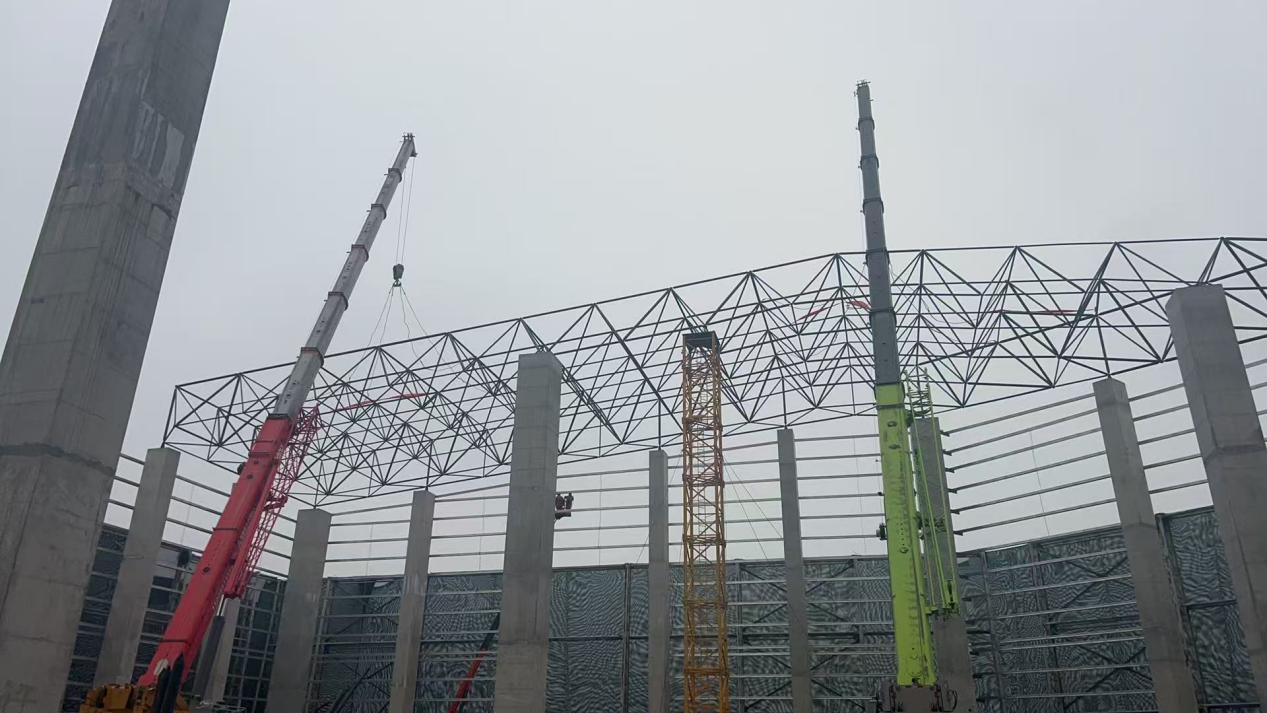 該網(wǎng)架跨度62米,覆蓋面積約600平方米,由600余根高強(qiáng)度螺栓連接的鋼構(gòu)件組成,總重量超23噸。此次吊裝作業(yè)面臨多重嚴(yán)峻挑戰(zhàn):儲焦場地內(nèi)焦灰漫天,細(xì)微粉塵極易附著于構(gòu)件連接節(jié)點(diǎn)與吊裝設(shè)備精密部件,不僅影響安裝精度,還可能引發(fā)設(shè)備故障;施工場地緊鄰生產(chǎn)區(qū)域,作業(yè)空間受限,且需嚴(yán)格遵守廠區(qū)“動火作業(yè)許可”“起重作業(yè)分級管控”等多重規(guī)定;同時,網(wǎng)架結(jié)構(gòu)受力復(fù)雜,吊裝過程中需精準(zhǔn)控制構(gòu)件姿態(tài),避免出現(xiàn)變形或連接偏差。