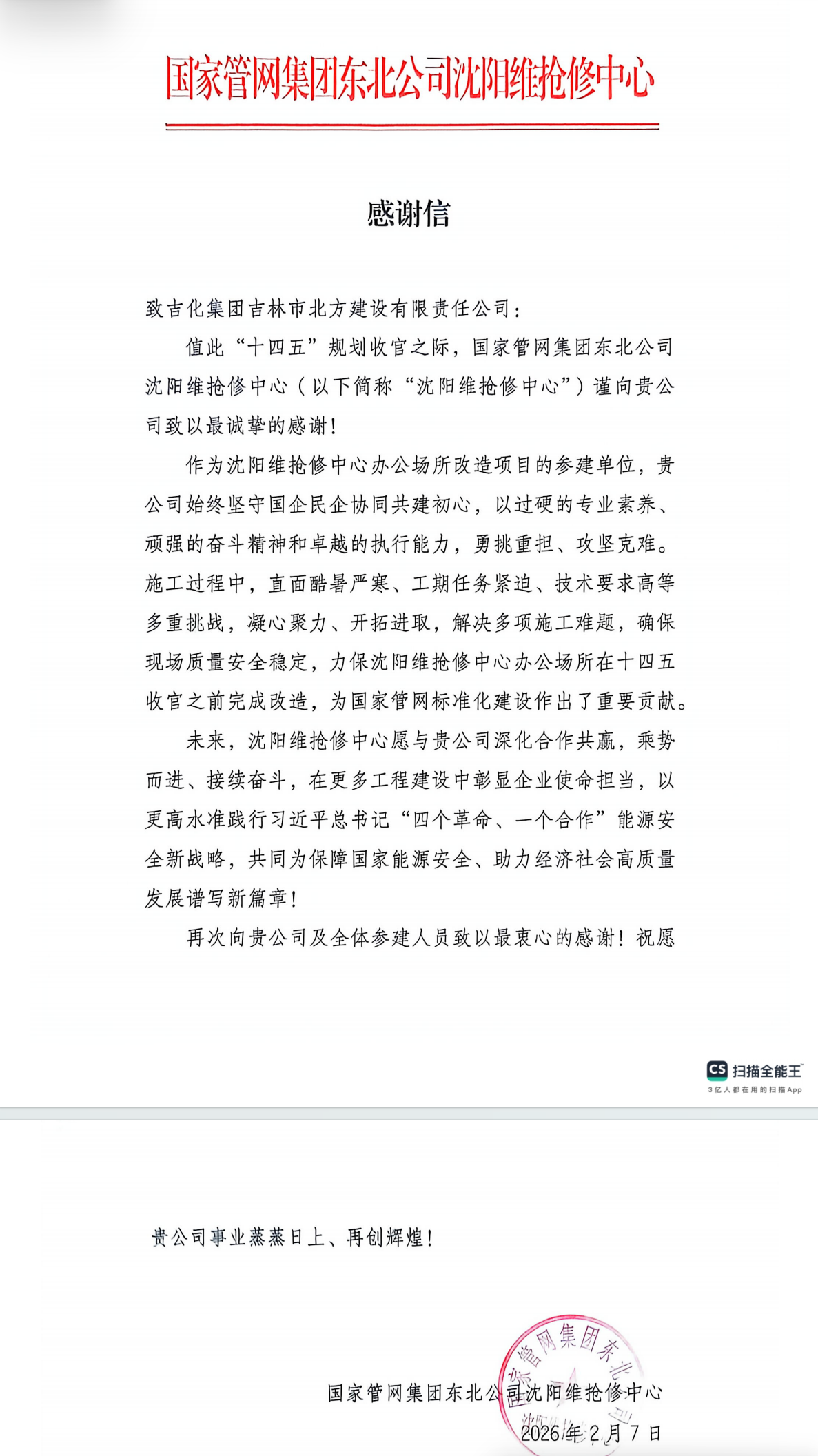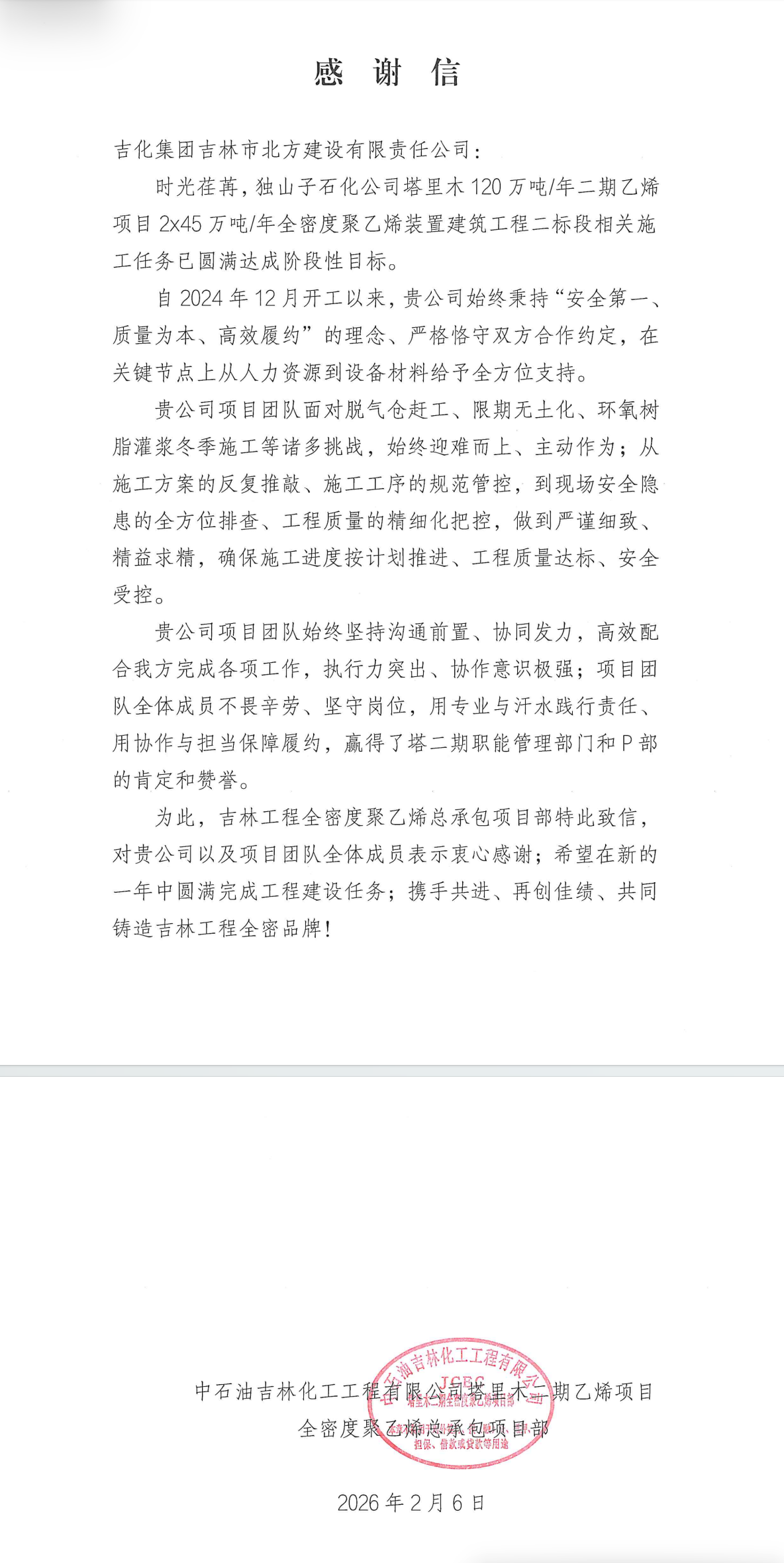 近日,我公司相繼收到中石油吉林化工工程有限公司與國(guó)家管網(wǎng)集團(tuán)東北公司沈陽(yáng)維搶修中心發(fā)來(lái)的感謝信。紙短情長(zhǎng),字字見(jiàn)心,這既是業(yè)主對(duì)我公司項(xiàng)目團(tuán)隊(duì)專業(yè)精神與辛勤付出的真摯認(rèn)可,更是對(duì)我公司技術(shù)實(shí)力與服務(wù)品質(zhì)的又一次有力印證。業(yè)主的每一次肯定,都是我們前行的最大動(dòng)力。未來(lái),我公司將繼續(xù)以“干好是唯一的選擇”為行動(dòng)自覺(jué),以更先進(jìn)的技術(shù)、更優(yōu)質(zhì)的服務(wù),為廣大合作伙伴創(chuàng)造更大價(jià)值。